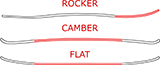 - Flat: Een board heeft een flat profiel wanneer er 100% contact is met de sneeuw, dit leidt tot meer stabiliteit dan een traditionele rocker en vereenvoudigt het maken van bochten.